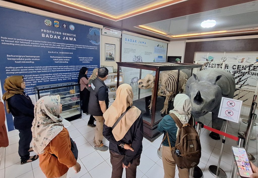 Mahasiswa kemudian mengikuti sesi diskusi mengenai metode penelitian pendugaan populasi badak jawa di Javan Rhino Study and Conservation Area (JRSCA). Materi meliputi penggunaan kamera jebak, analisis tanda keberadaan satwa, dan pendekatan monitoring satwa kunci berbasis sains. Rombongan juga memperoleh informasi terkait Operasi Merah Putih Translokasi Badak Jawa sebagai strategi penyelamatan yang sedang dilakukan oleh TNUK. Kegiatan berlanjut dengan peninjauan fasilitas konservasi badak jawa dan pengamatan owa jawa (Hylobates moloch) melalui perjumpaan langsung maupun identifikasi suara. Pada sore hari, peserta mempelajari pengelolaan ekowisata berkelanjutan di Air Panas Cibiuk, yang menunjukkan integrasi konservasi dengan pemanfaatan jasa lingkungan.