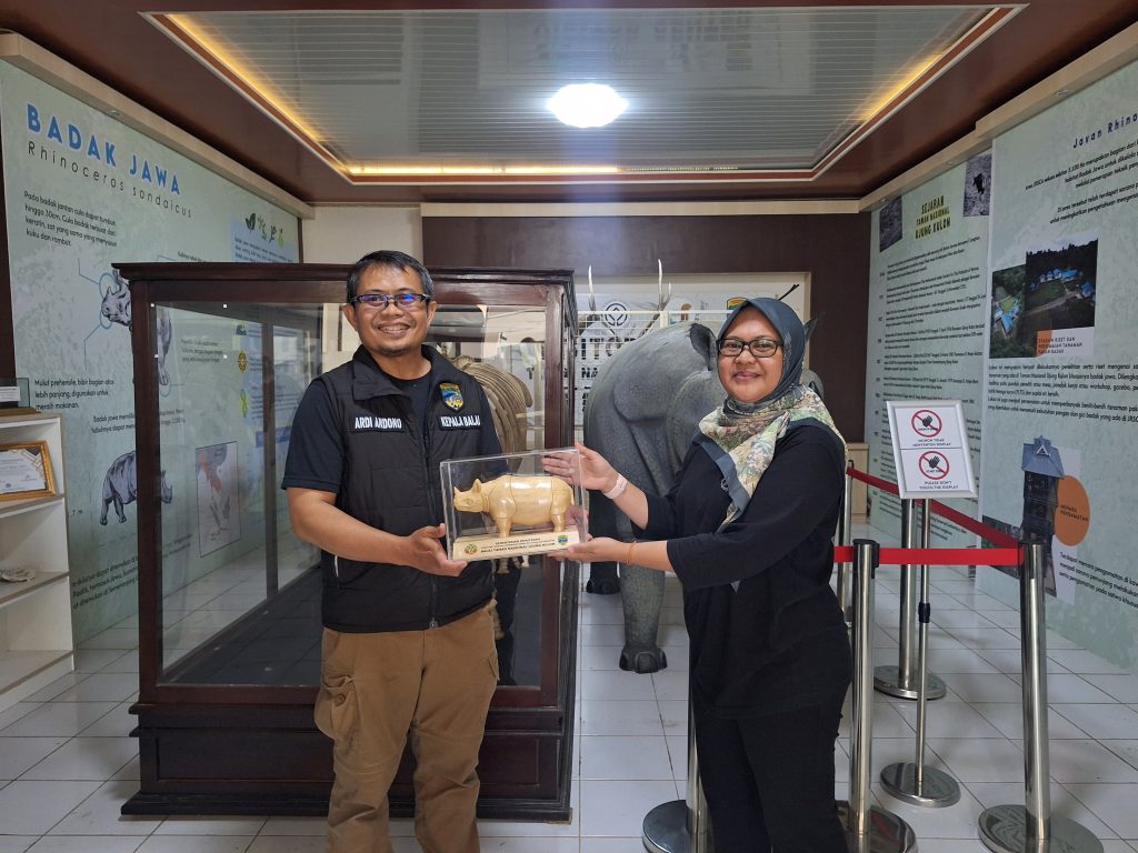Kegiatan kunjungan lapangan ini ditutup dengan sesi evaluasi bersama Pengelola Taman Nasional Ujung Kulon dan penyerahan cinderamata berupa patung kayu Badak Jawa kepada PSDIK Fakultas Kehutanan UGM.